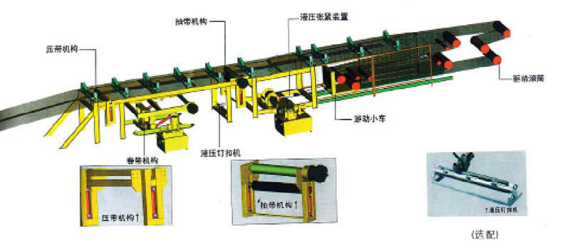 1、用磁力啟動器啟動液壓站用手動控制閥控制壓帶機構(gòu)將皮帶一端壓緊。同時控制抽帶機構(gòu),將皮帶夾在上下滾筒之間。