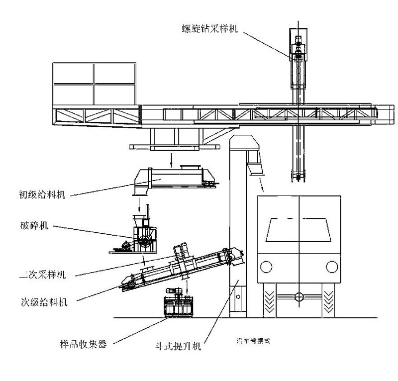 該圖片展示了一種典型的橋式螺旋鉆采樣系統(tǒng)。該系統(tǒng)由橋式大車、移動(dòng)小車、螺旋鉆采樣機(jī)及驅(qū)動(dòng)裝置、制樣設(shè)備、電氣控制系統(tǒng)等組成。