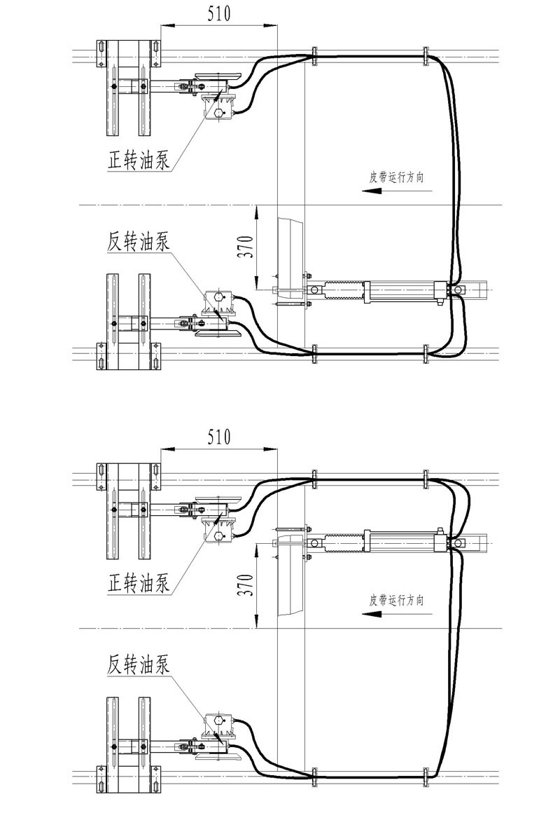 全部安裝完成后,模擬皮帶跑偏,輪流盤動(dòng)左右檢驅(qū)輪,讓油缸帶動(dòng)調(diào)心托輥旋轉(zhuǎn),循環(huán)5次。